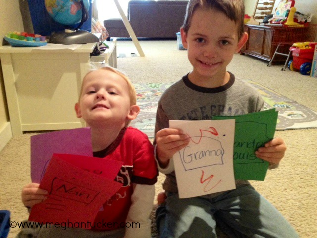 Day 2: We made cards to send to Grandparents. They are always asking for things in the mail from the boys and with the busy-ness of life, we sometimes forget. Not this month! These cards will be heading out in tomorrow’s mail to Florida and Brentwood, TN.