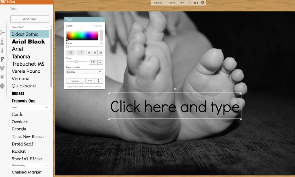 2. Then click on the “P” icon on the left of the page. You’ll see a long list of fonts show up. Choose which font you want and click on it. Then click “Add Text”. Your screen should then look something like this.