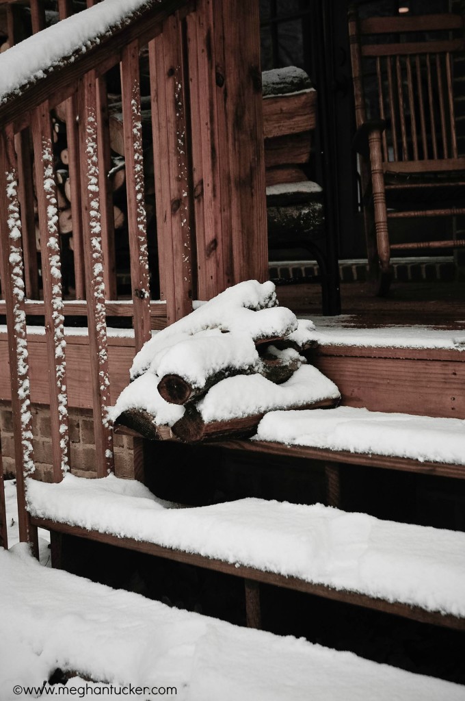 Love the contrast of the snow to the brown stairs/porch/rocking chair/wood. Lovely image of brown.